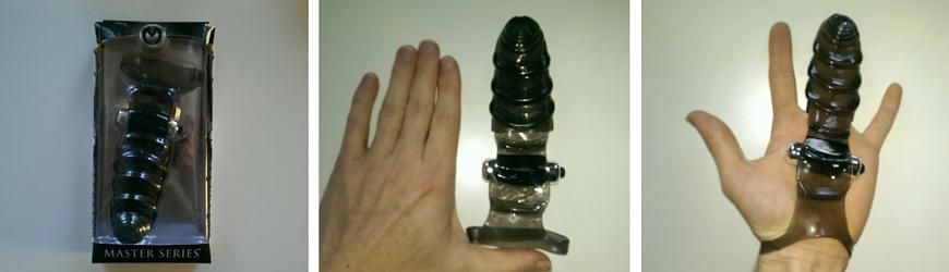 Cuando abrimos este dedo vibrador, nos miramos el uno al otro con cara de incertidumbre. Nunca habíamos visto algo así y nos pareció que tenía una pinta extraña. Es una funda para el dedo. El guante vibrador Bang Bang lo fabrica Master Series.