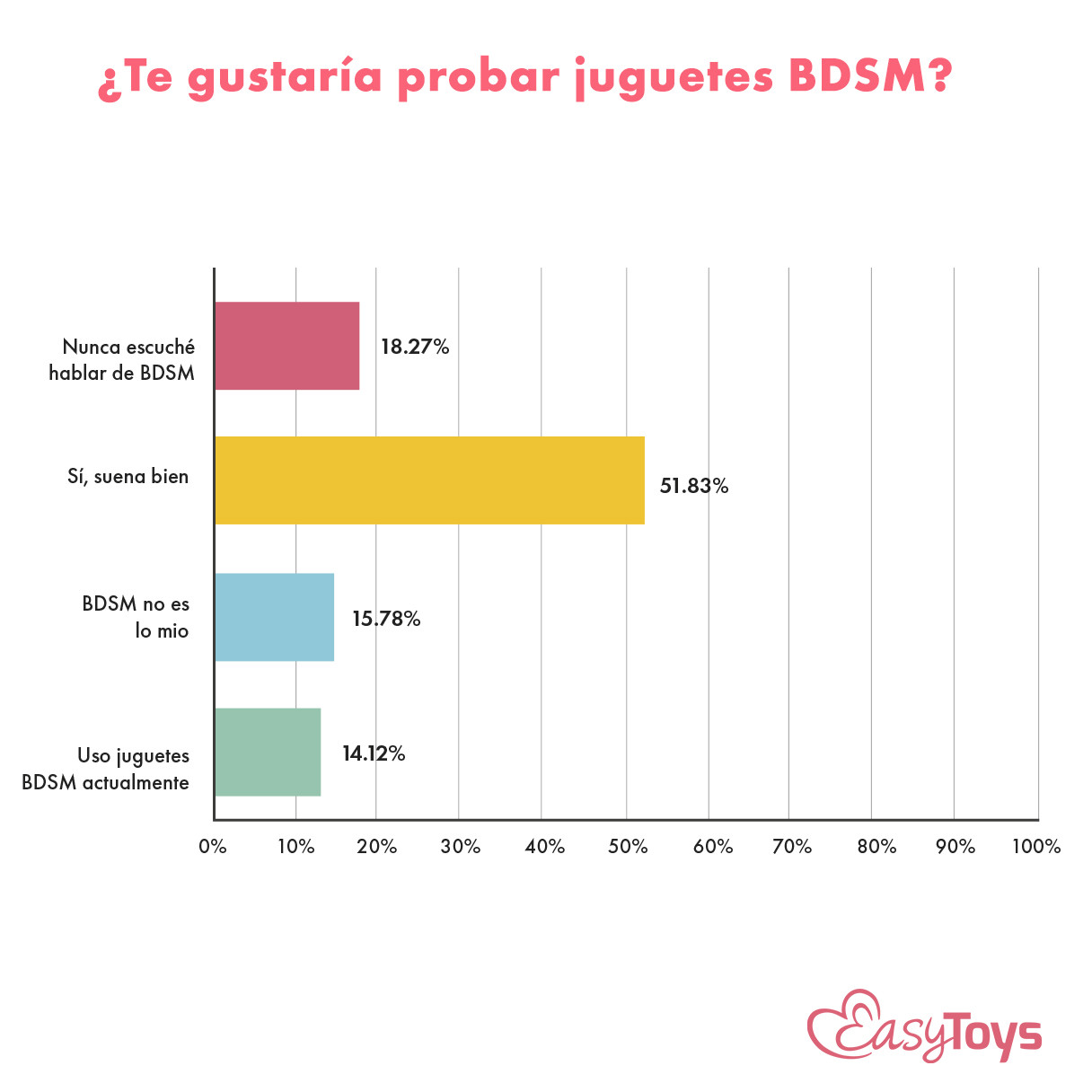 Pese a que el BDSM sigue siendo un tabú y hasta desconocido, a la mayoría le gustaría probar juguetes BDSM o ya lo están usando. También, aunque reducido, un 18.27% comentó que nunca ha escuchado hablar de juguetes BDSM. Y un 15.78% que no es lo suyo. Como era de esperarse, estas respuestas se obtienen en ciudades más pequeñas y conservadoras.